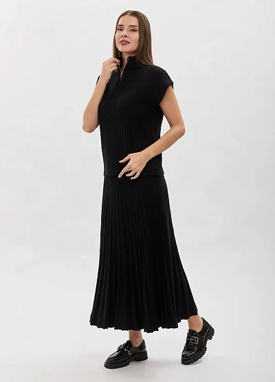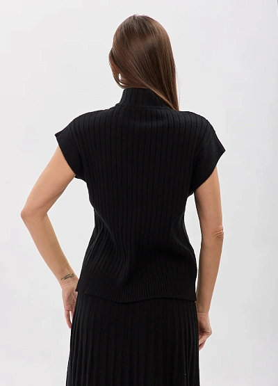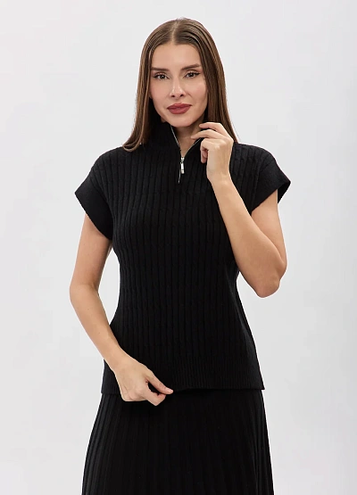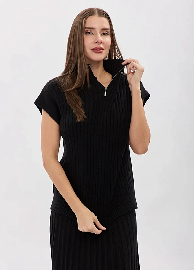 • Стильный трикотажный топ в чёрном цвете — современное решение для лаконичных и элегантных образов. Вертикальная вязка визуально вытягивает силуэт, подчёркивая фигуру, а аккуратный воротник-стойка с молнией добавляет образу характер и универсальность. Модель с коротким рукавом отлично подходит для многослойных сочетаний и самостоятельных выходов.