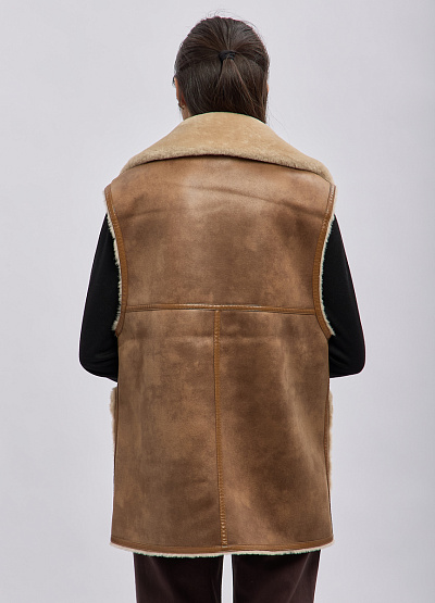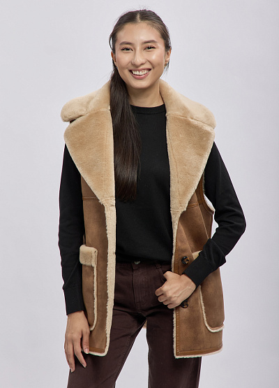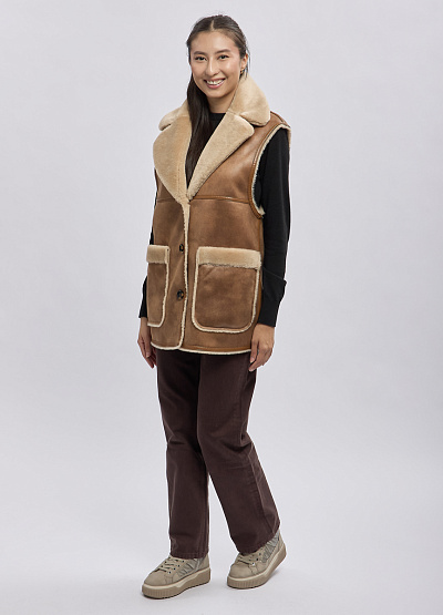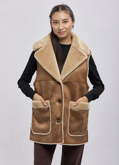 Женский утеплённый жилет в стиле casual выполнен из мягкой искусственной замши с внутренней отделкой под овчину. Модель сочетает в себе практичность и актуальный дизайн: объёмный воротник, аккуратные пуговицы и накладные карманы создают уютный и стильный образ. Жилет отлично подходит для многослойных комплектов в прохладную погоду, добавляя образу тепла и выразительности.