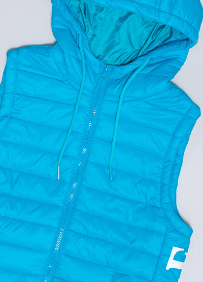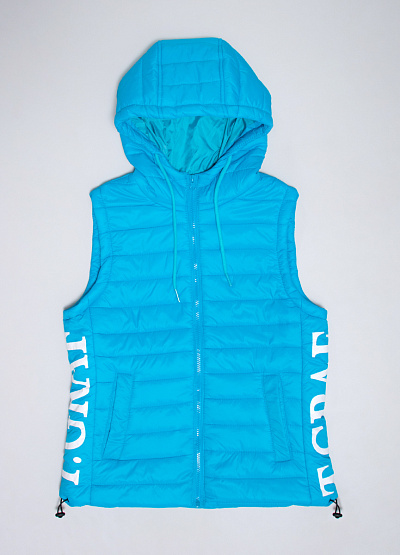 • Женский стеганый жилет от бренда Thomas Graf. Модель на кулиске для регулирования. Крупный принт по бокам. Застежка-молния по центру. Прорезные карманы. Капюшон на шнурке.