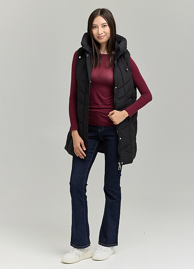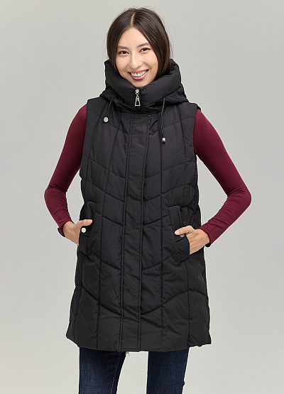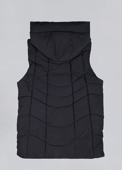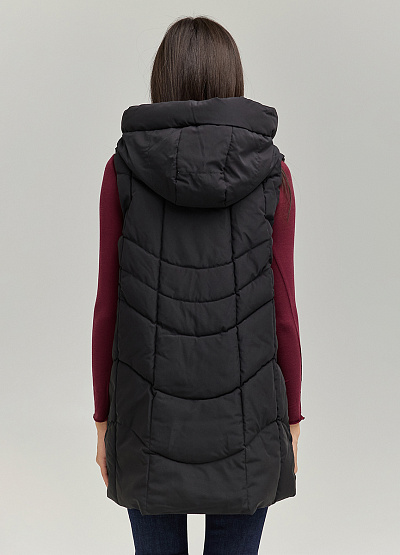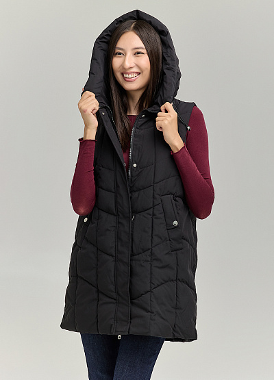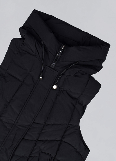 Стёганый жилет с капюшоном и удлинённым силуэтом — идеальный вариант для межсезонья. Лаконичный чёрный цвет делает его универсальным, а удобный крой обеспечивает комфорт при активных прогулках.