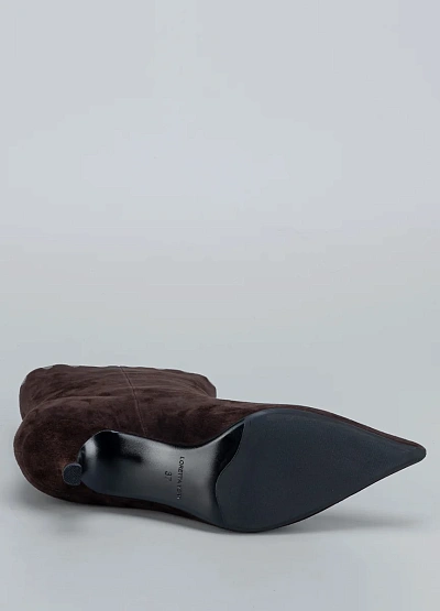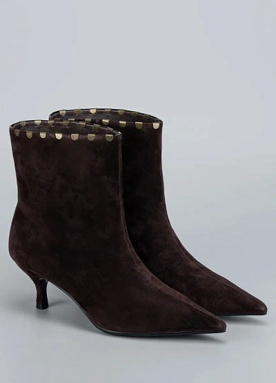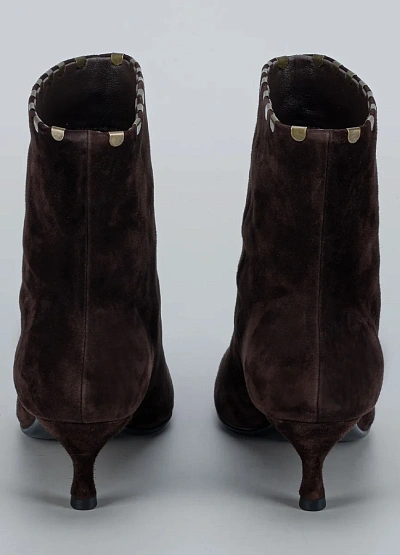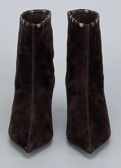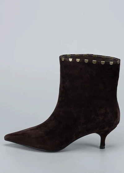 • Женские ботильоны Loretta Very выполнены из мягкой натуральной замши глубокого шоколадного оттенка. Изящный силуэт с заострённым носком и невысоким каблуком «kitten heel» создаёт женственный образ, сохраняя при этом комфорт в течение дня. Металлический декор по краю голенища придаёт модели выразительность и стильный акцент. Эти ботильоны станут идеальным выбором для элегантных образов в осенне-зимний сезон.