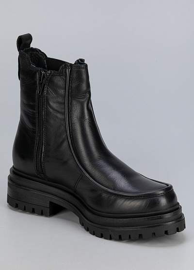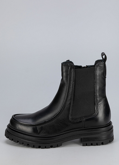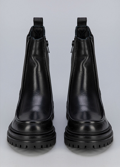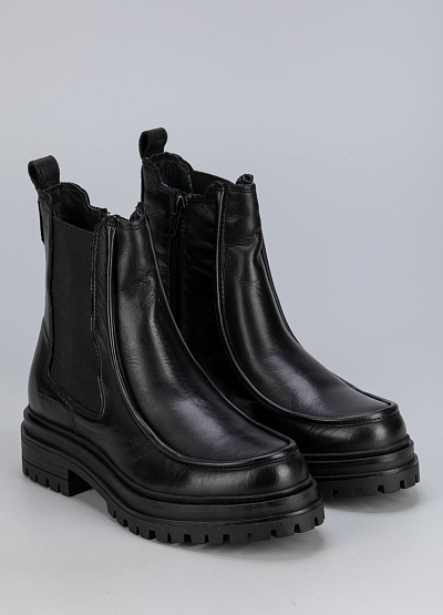 • Женские ботинки-челси в классическом чёрном цвете — воплощение современного комфорта и лаконичного стиля. Модель выполнена из гладкой кожи с лёгким блеском, что делает её универсальной для любого гардероба. Эластичные вставки по бокам и удобная петелька на заднике обеспечивают лёгкость при надевании, а массивная рельефная подошва добавляет устойчивости и актуальности. Эти ботинки станут стильным акцентом в городском образе и подарят комфорт на весь день.