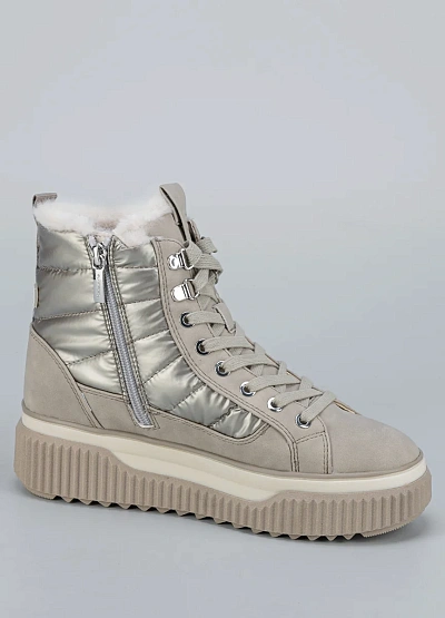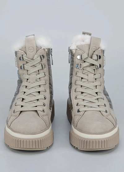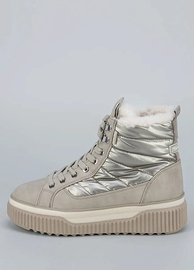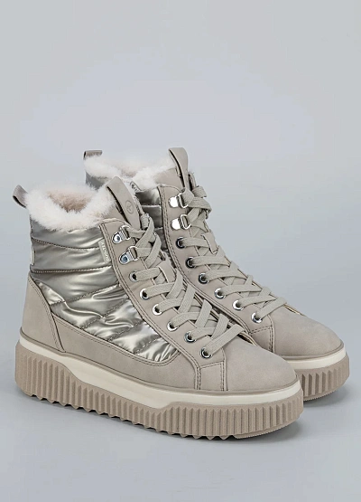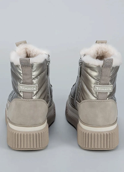 • Женские зимние ботинки Tamaris в светлом оттенке — стильный выбор для холодного сезона. Металлизированные вставки придают модели современный вид, а меховая подкладка сохраняет тепло и комфорт.