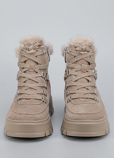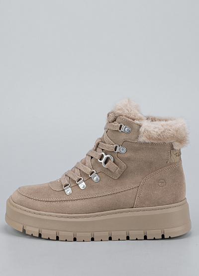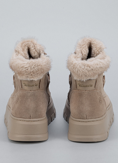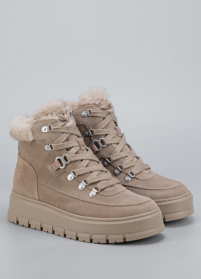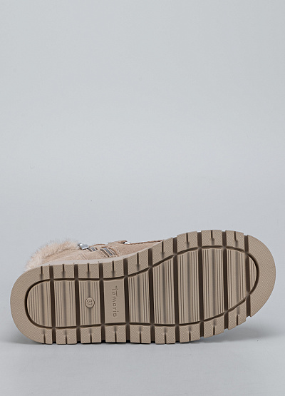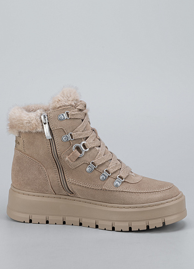 • Стильные женские зимние ботинки Tamaris в бежевом цвете — идеальный выбор для комфортных прогулок в холодный сезон. Мягкий велюровый верх, аккуратная альпинистская шнуровка и пушистая опушка создают образ тёплой, уютной и при этом современной пары. Высокая рельефная подошва обеспечивает отличную амортизацию и уверенное сцепление, а внутренний мех сохраняет тепло даже в морозы.