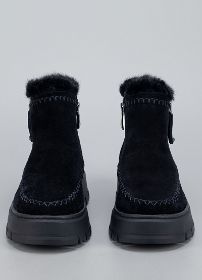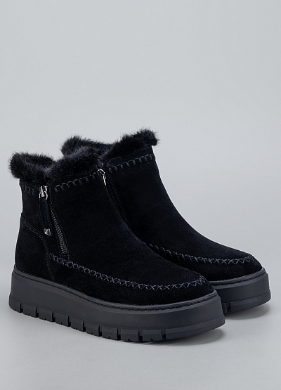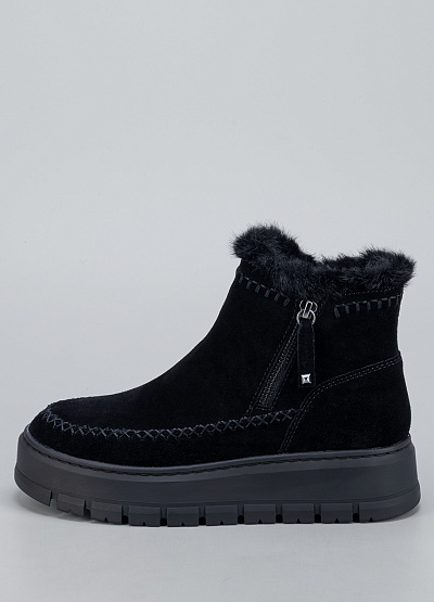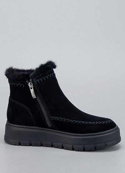 • Женские ботинки Tamaris в универсальном чёрном цвете созданы для тех, кто ценит тепло, комфорт и стиль в холодный сезон. Модель выполнена из мягкого замши, украшена аккуратной контрастной строчкой и пушистой опушкой по верху, что добавляет образу уюта и элегантности. Удобная боковая молния обеспечивает лёгкое надевание, а высокая рельефная подошва гарантирует устойчивость и защиту от скольжения.