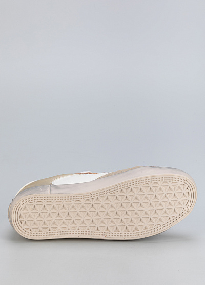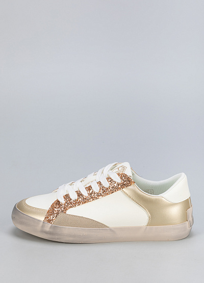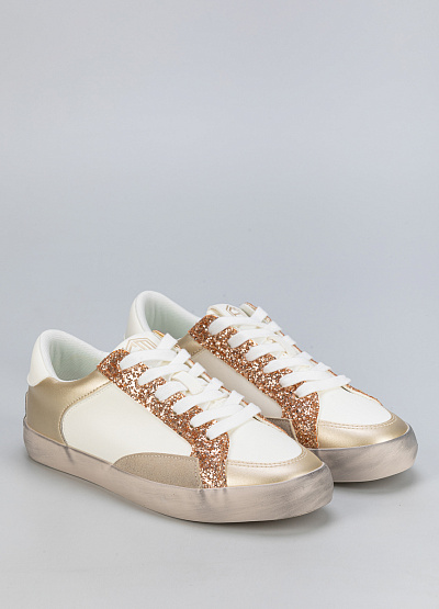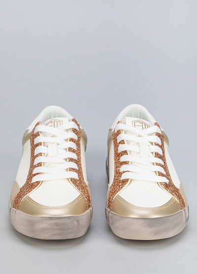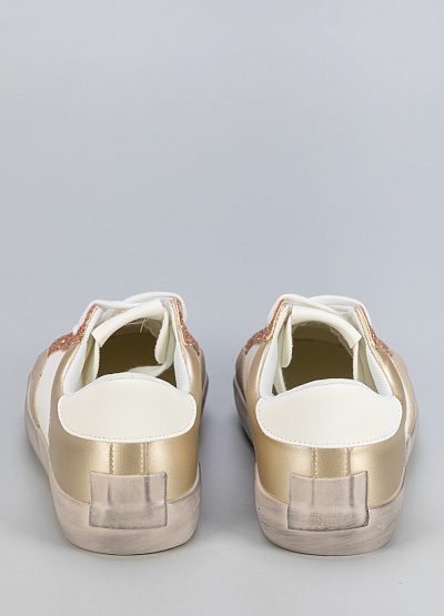 • Женские кеды в бело-золотом цвете с блестящей отделкой добавляют яркости и гламура повседневному образу. Модель выполнена в уличном стиле с лёгким налётом винтажности и подойдёт для тех, кто хочет выделиться.