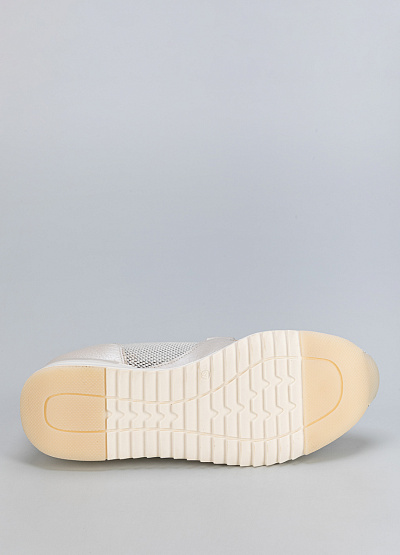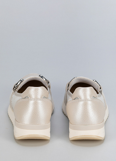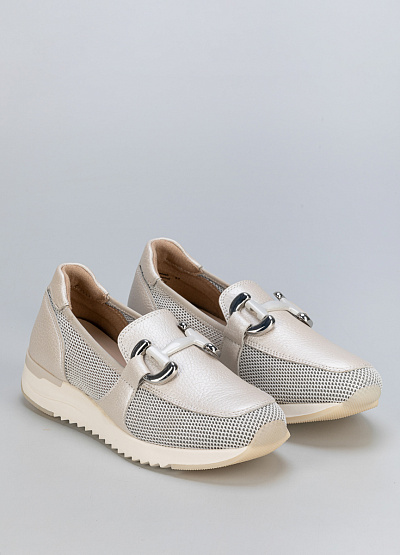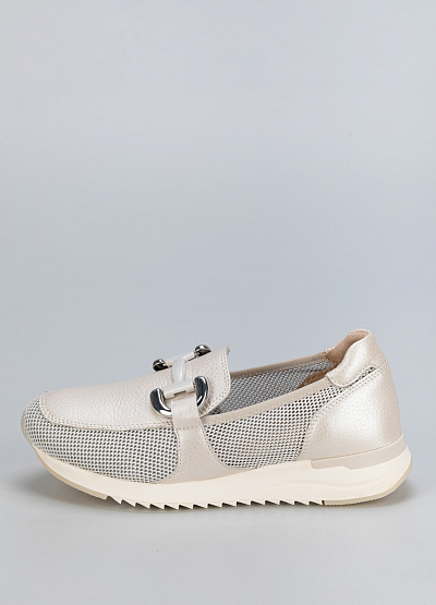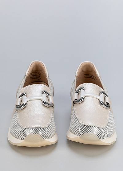 • Женские лоферы белого цвета с серебристыми акцентами — современный и стильный вариант для городской жизни.