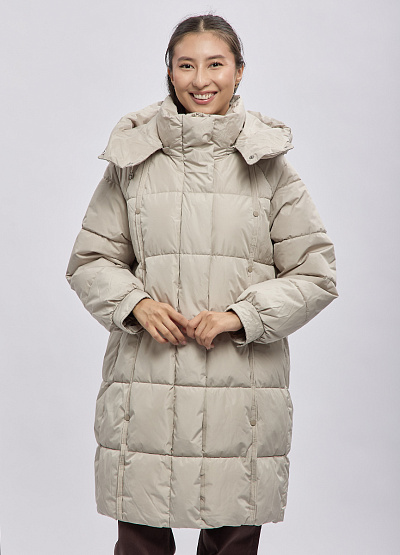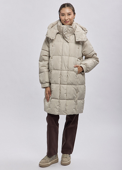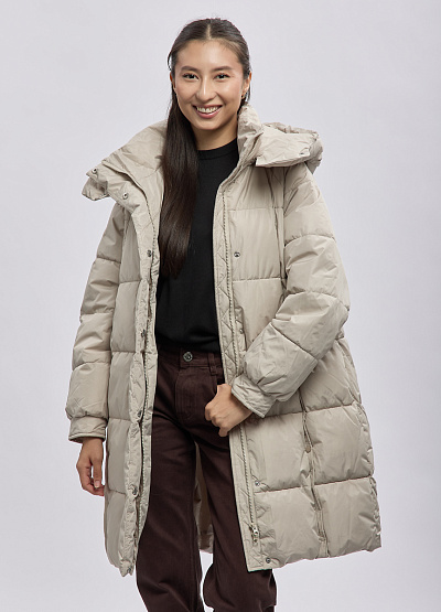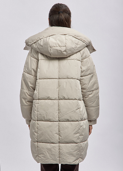 • Женское утеплённое пальто выполнено в современном минималистичном стиле и предназначено для комфортной носки в холодное время года. Модель отличается объёмным силуэтом и продуманной стёжкой, которая равномерно распределяет утеплитель и сохраняет тепло. Высокий воротник-стойка в сочетании с капюшоном надёжно защищает от ветра и холода, а нейтральный оттенок делает пальто универсальным элементом повседневного гардероба.
