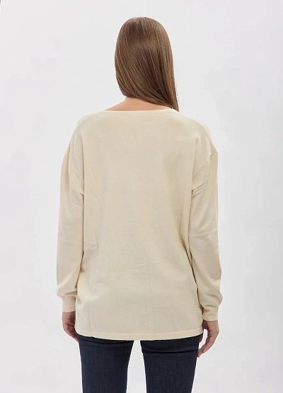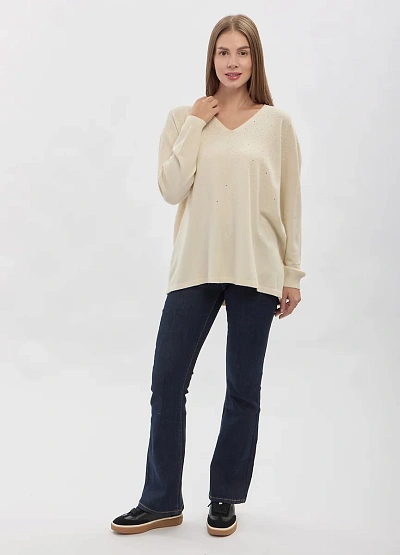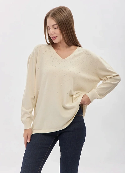 • Элегантный женский джемпер свободного силуэта выполнен в мягком светлом оттенке и украшен деликатным рассыпным декором из мелких страз. V-образный вырез визуально вытягивает линию шеи и подчёркивает женственность образа, а лаконичный крой делает модель универсальной для повседневных и более нарядных сочетаний. Мягкий трикотаж приятно прилегает к телу и обеспечивает комфорт в течение всего дня.