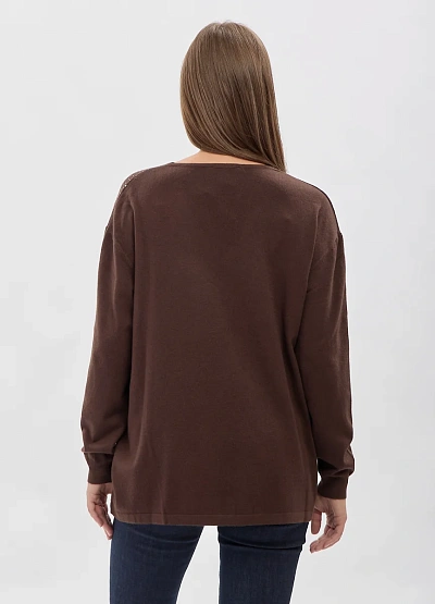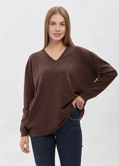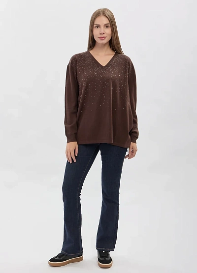 • Женский трикотажный пуловер свободного кроя с V-образным вырезом — стильная и комфортная модель для повседневного гардероба. Мягкий материал приятно ощущается на коже, а рассыпь декоративных страз добавляет образу утончённый акцент без излишней яркости. Универсальный силуэт легко сочетается с джинсами, брюками и юбками, создавая аккуратные и современные образы.