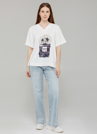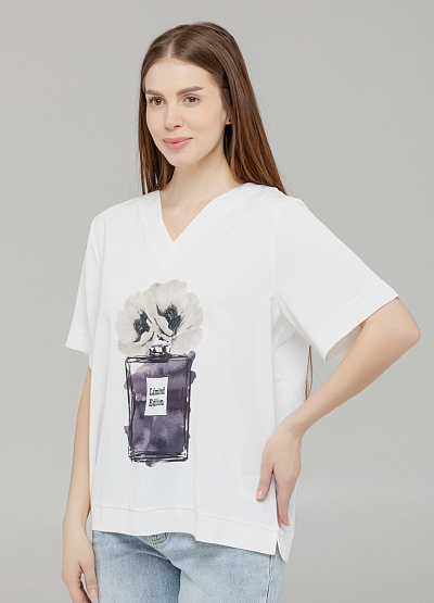 Глубокий V-образный вырез придаёт образу лёгкость, а принт с изображением парфюмерного флакона и надписью "Limited Edition" подчёркивает индивидуальность. Носите с джинсами, классическими брюками или юбкой — универсальный формат для города, офиса или прогулок.