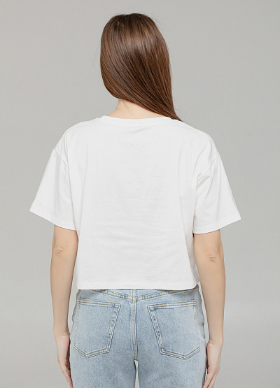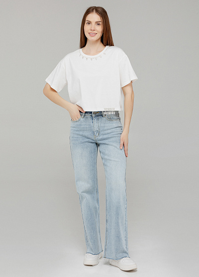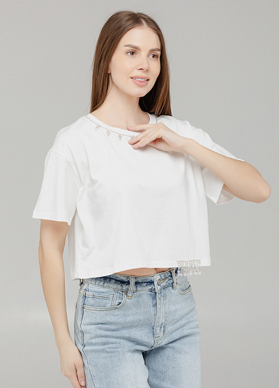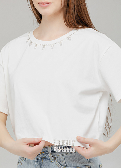 • Элегантная интерпретация базовой футболки — укороченная модель свободного кроя с деликатным блеском. Горловина украшена россыпью бусин и страз, создавая эффект "ожерелья", а нижний край дополнен бахромой из стекляруса, которая красиво ловит свет при движении. Идеальный выбор для тех, кто хочет добавить утончённый акцент в повседневный образ.
