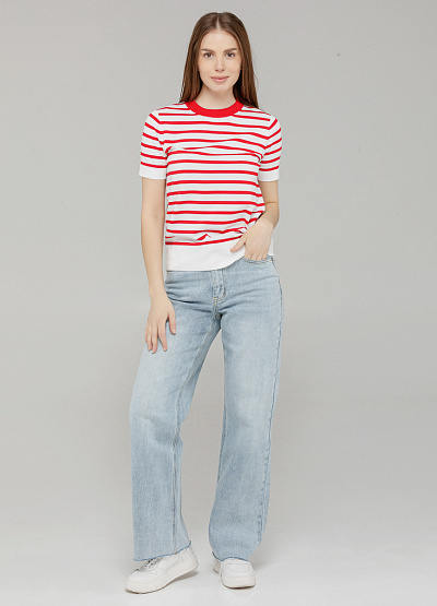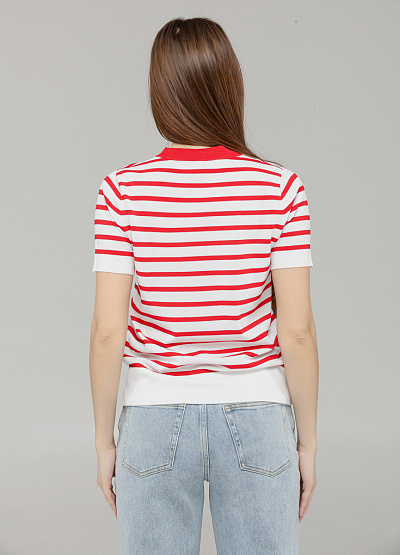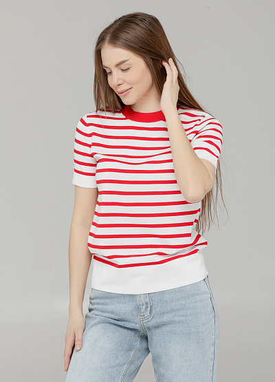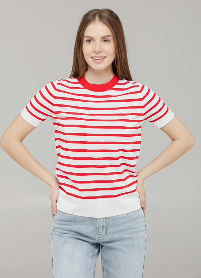 • Яркая и стильная футболка с коротким рукавом в классическую полоску — идеальный выбор для создания повседневного образа с акцентом на свежесть и легкость. Красно-белый принт добавляет образу динамики, а мягкий трикотаж приятно ощущается на теле.