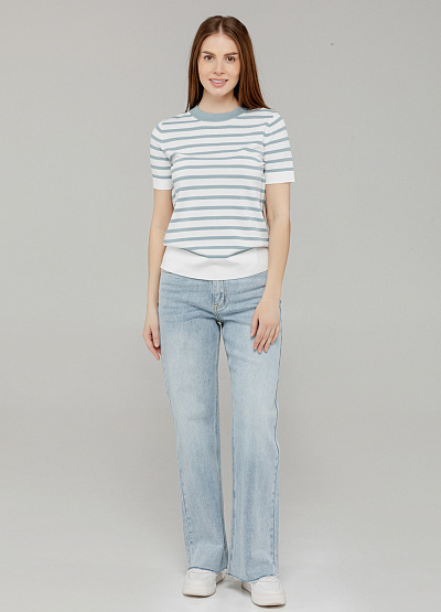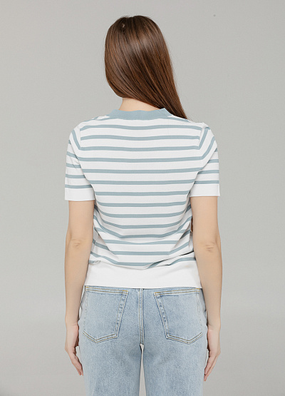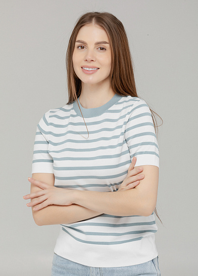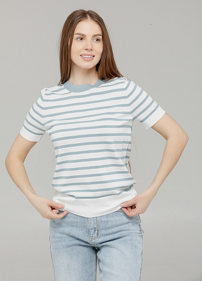 • Яркая и стильная футболка с коротким рукавом в классическую полоску — идеальный выбор для создания повседневного образа с акцентом на свежесть и легкость. Голубая полоска добавляет образу динамики, а мягкий трикотаж приятно ощущается на теле.