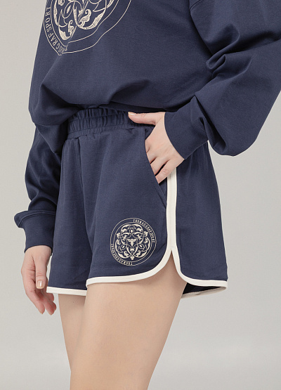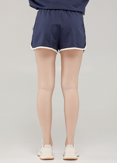 • Эти тёмно-синие шорты — отличный выбор для активного образа жизни и комфортного отдыха. Выполнены из мягкого трикотажа, они не сковывают движений и хорошо сидят благодаря эластичному поясу. Светлая окантовка подчёркивает спортивный стиль, а фирменный принт добавляет акцента.
