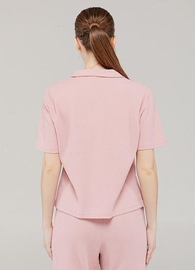 Нежная женская футболка-поло в пудрово-розовом цвете — это базовая вещь для комфортных и стильных образов. Модель выполнена из мягкого трикотажа с лёгкой фактурой, имеет короткий рукав, рубашечный воротник и V-образный вырез, что придаёт образу женственность и аккуратный силуэт.